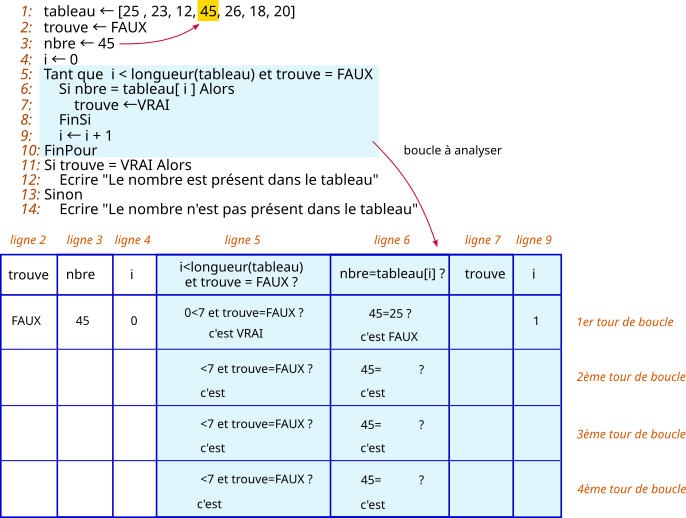Tant que i < longueur(tableau) et trouve = FAUX