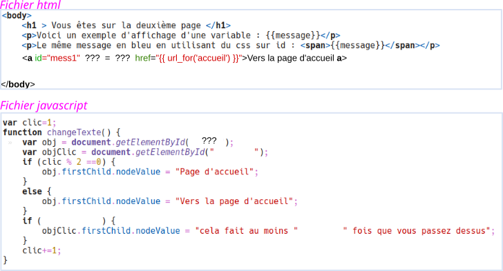 L'implémentation du Javascript dans l'environnement Flask est similaire au codage classique : il faut juste veiller à utiliser les chemins en respectant le codage dans Flask.