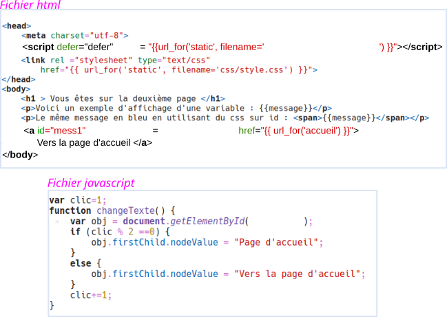 L'implémentation du Javascript dans l'environnement Flask est similaire au codage classique : il faut juste veiller à utiliser les chemins en respectant le codage dans Flask.